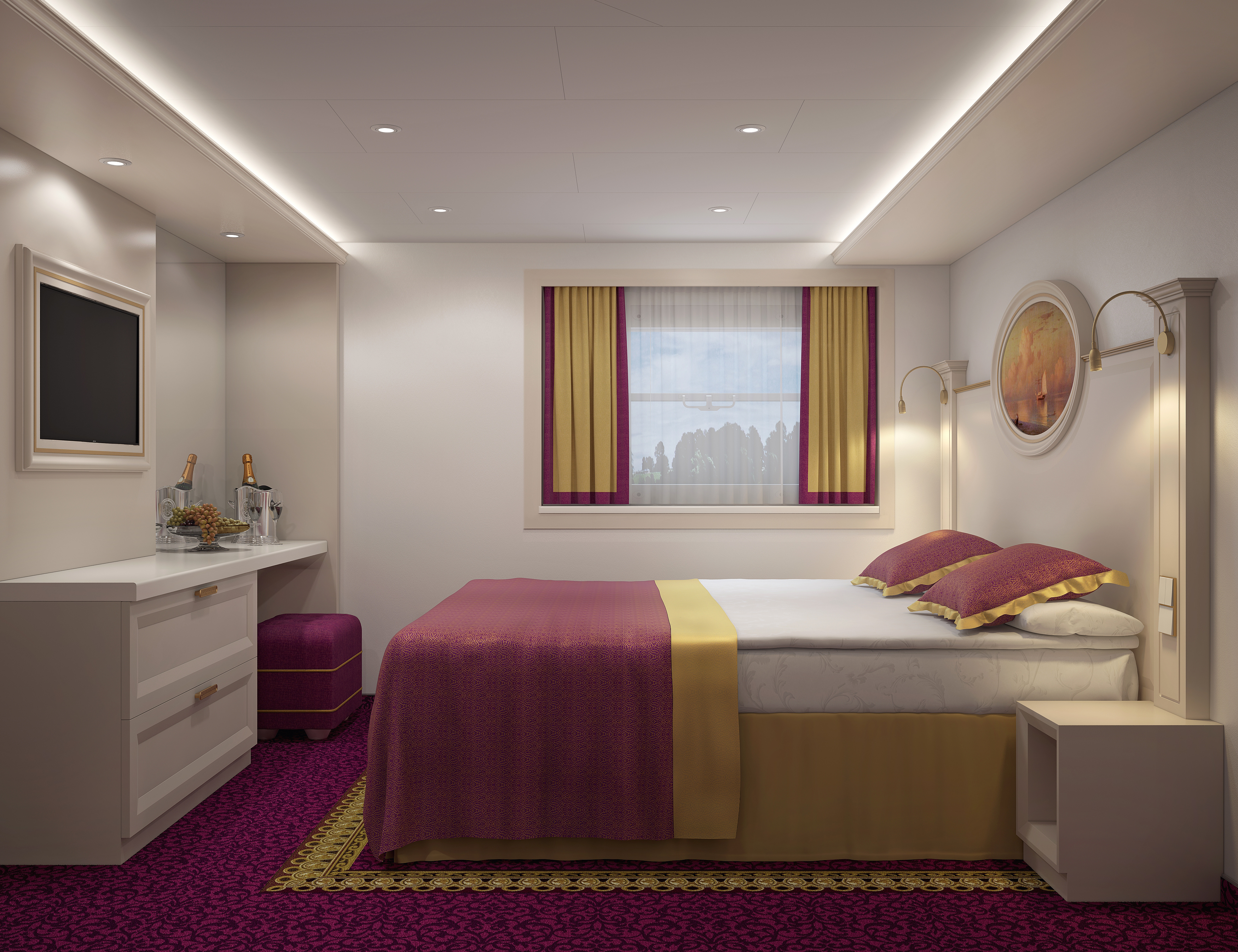 В каюте: система индивидуального климат-контроля, туалет\душ, телевизор, холодильник, платяной шкаф и панорамное окно.