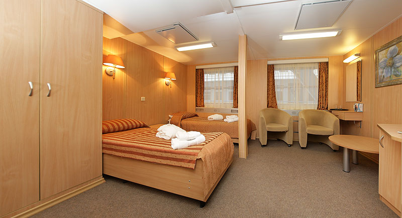 Двухместная каюта увеличенной площади, расположенная на шлюпочной палубе. В каюте: санблок (душ, туалет), две односпальные кровати, телевизор, кондиционер, холодильник, сейф.