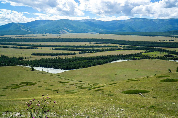 - Дальше по дороге туристы встретят Пазырыкские курганы. Цепочка из 5 больших курганов, представляющих собой захоронения VI - VII вв. до н.э. знатных кочевников, расположены на живописном плато. Затем преодоление Улаганского перевала – одного из самых высоких на Алтае, высотой 2080 м. На вершине перевала находится беседка, а деревья повязаны белыми ленточками – поклонение духам Алтая. Отсюда видны вершины Восточного Алтая и Курайского хребта. Запах наполнен свежестью и озерной влагой, а берега озер обрамляют лиственница, кедр, карликовая береза и можжевельник.