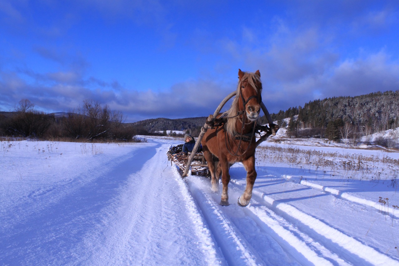 Завершающая поездка по полюбившимся взору окрестностям, возможность отточить навыки управления санями, взглянуть в задумчивые глаза лошади и покормить ее сеном, погулять по вершине горы высотой более 500 метров над уровнем моря, сделать памятные фотографии на фоне хребтов Крака, малый и большой Шатак. (Если захотите пройди эту прогулку верхом (за доп.плату), сообщите инструктору накануне).