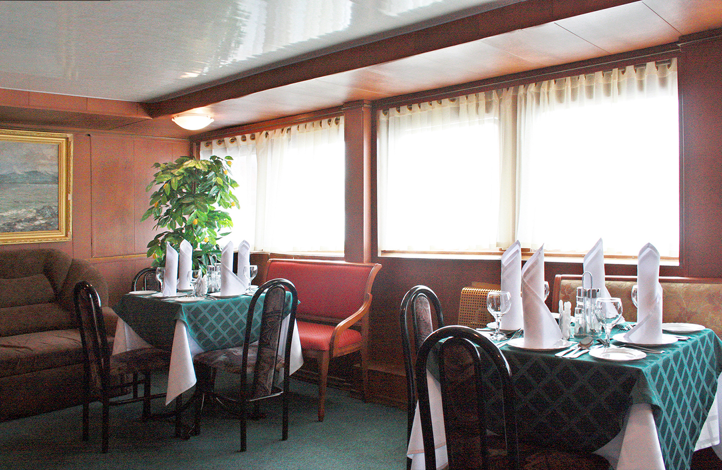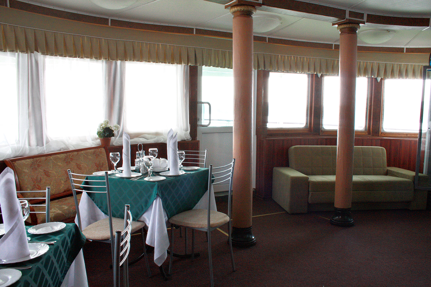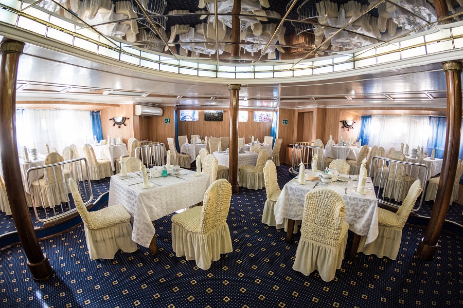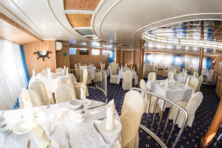 В уютных ресторанах и баре на борту можно вкусно поесть, а также приятно провести время с друзьями и близкими людьми. Есть возможность заранее заказать диетическое питание во время круиза.