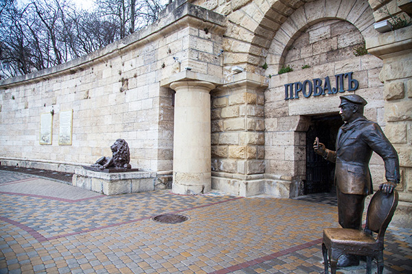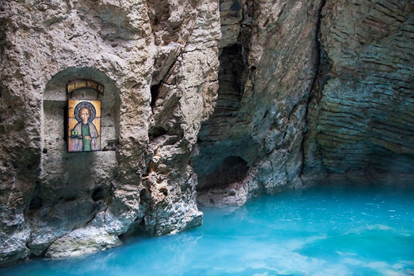 - Посещение пятигорского Провала – маленького озерка в толще горного склона. В скальной нише над водой установлена икона Святого Целителя Пантелеймона. Озеро это непростое. Оно наполнено горячей подземной водой аквамаринового цвета. Яркий цвет объясняется содержанием в воде сероводорода и особых бактерий.