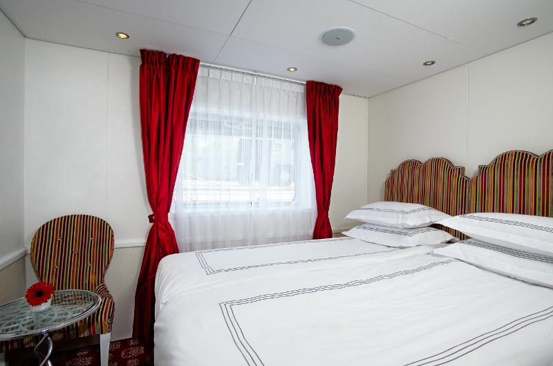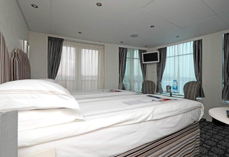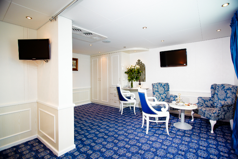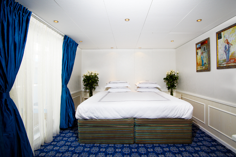 В каждой каюте: двуспальная кровать (за исключением кают, расположенных на нижней палубе), душ, туалет, кондиционер, шкаф, телевизор, мини-холодильник, фен, сейф, радиоточка, электрическая розетка 220 В, внутренняя телефонная связь, ROOM-сервис.