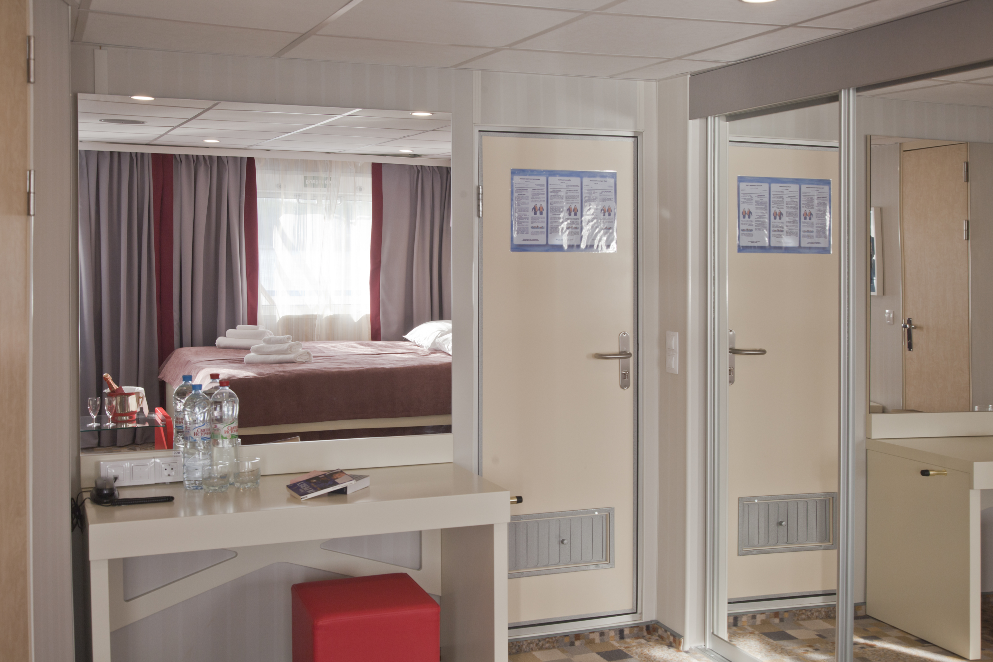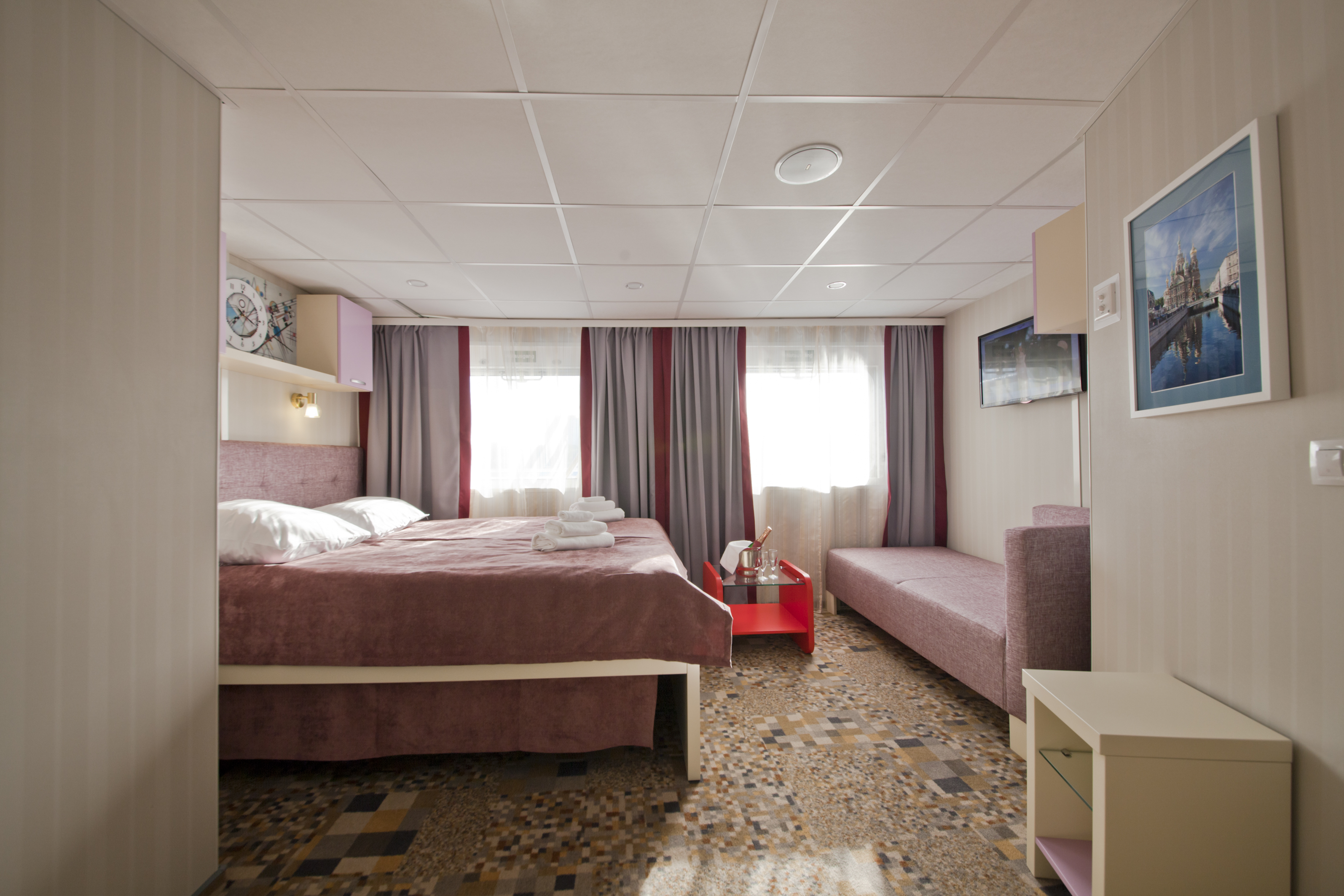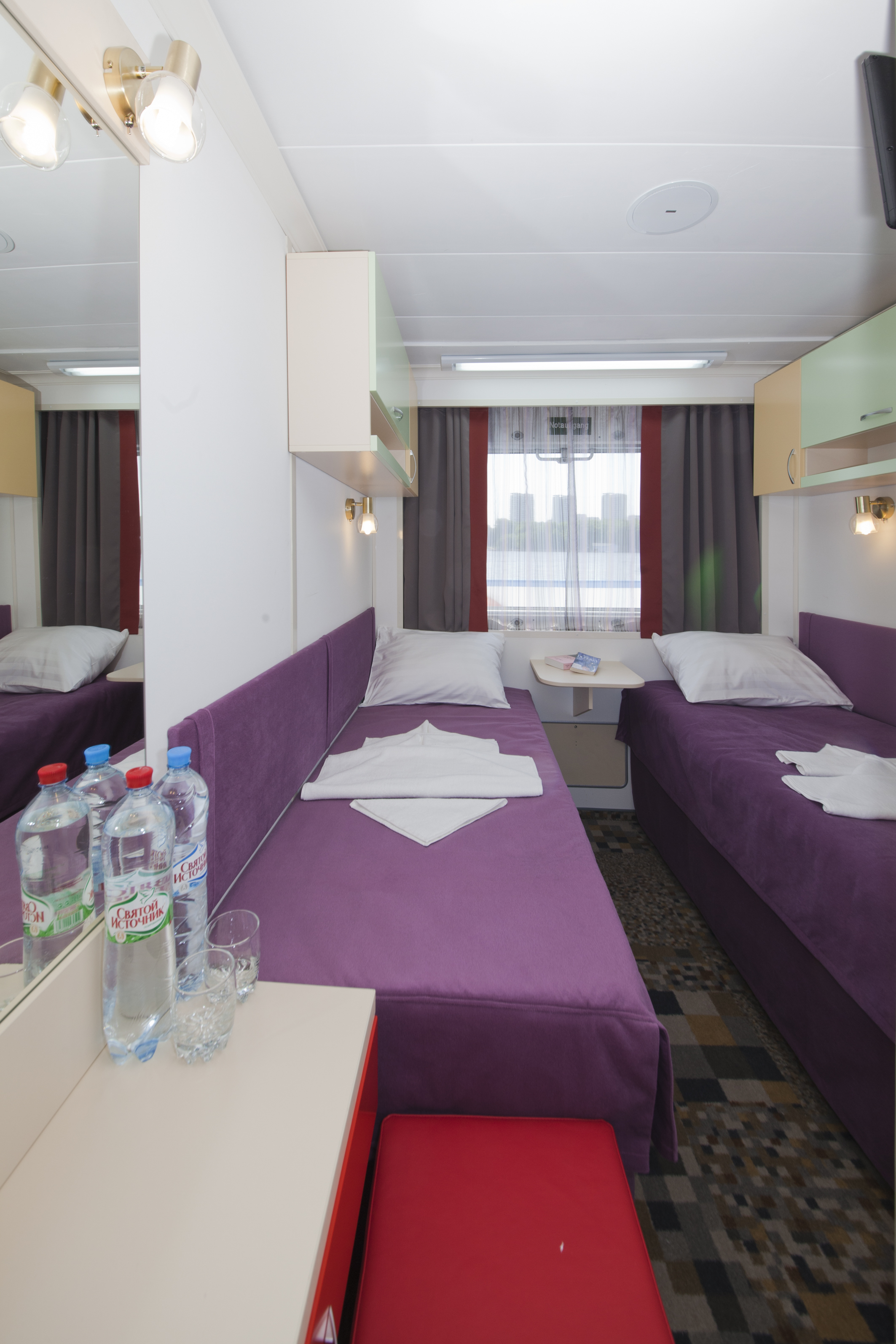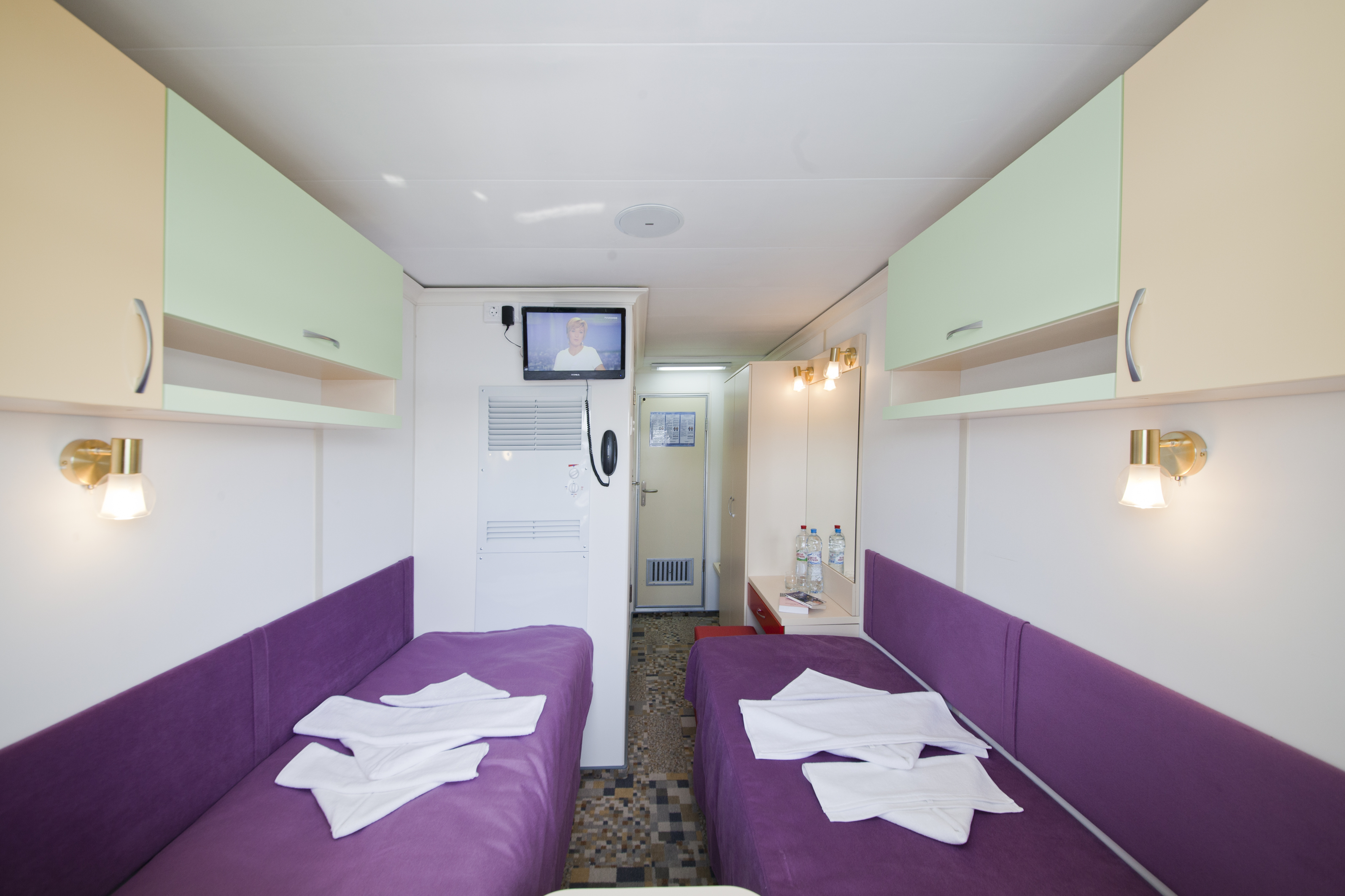 Все каюты оборудованы: кроватями, удобствами (душем, туалетом), системой индивидуального климат –контроля, мини-холодильником, радио и широкими окнами.