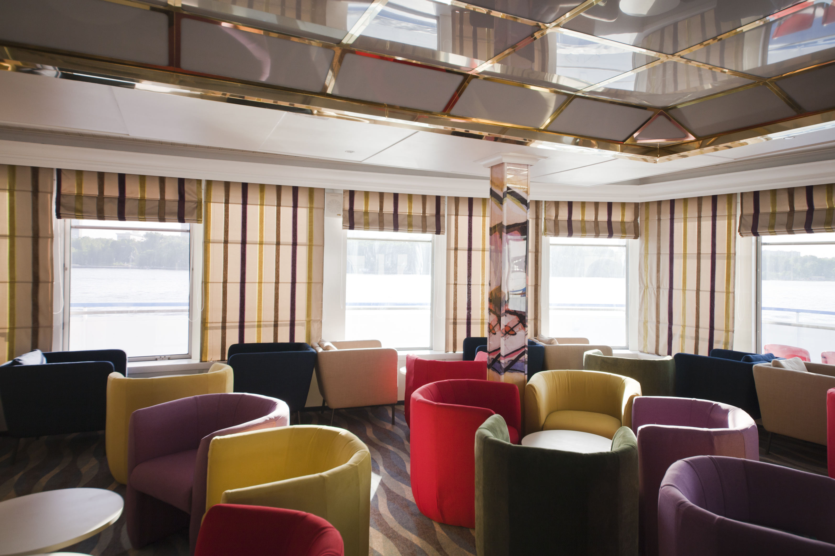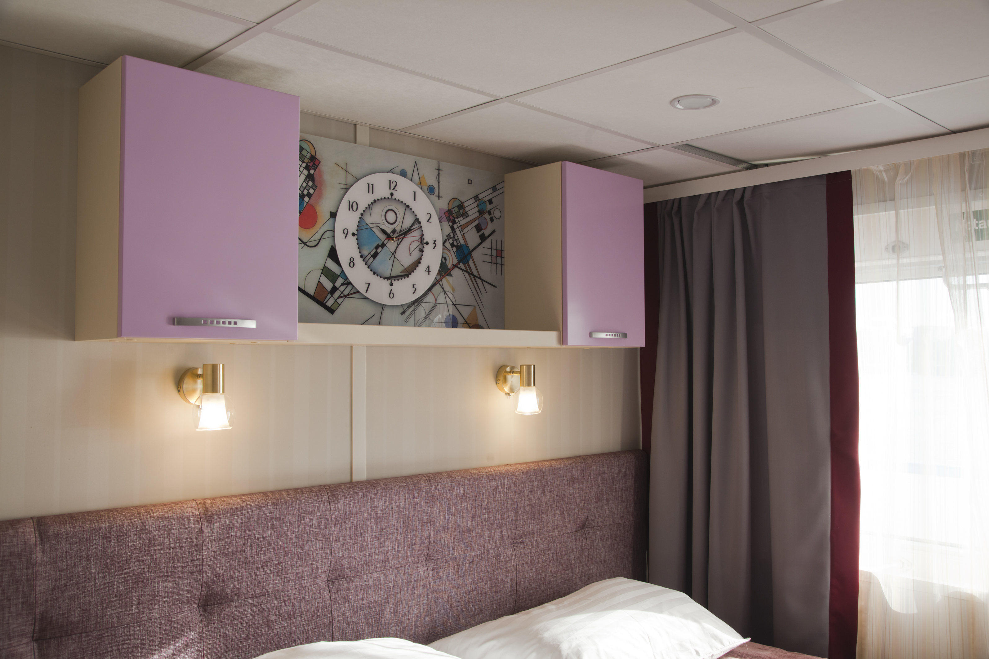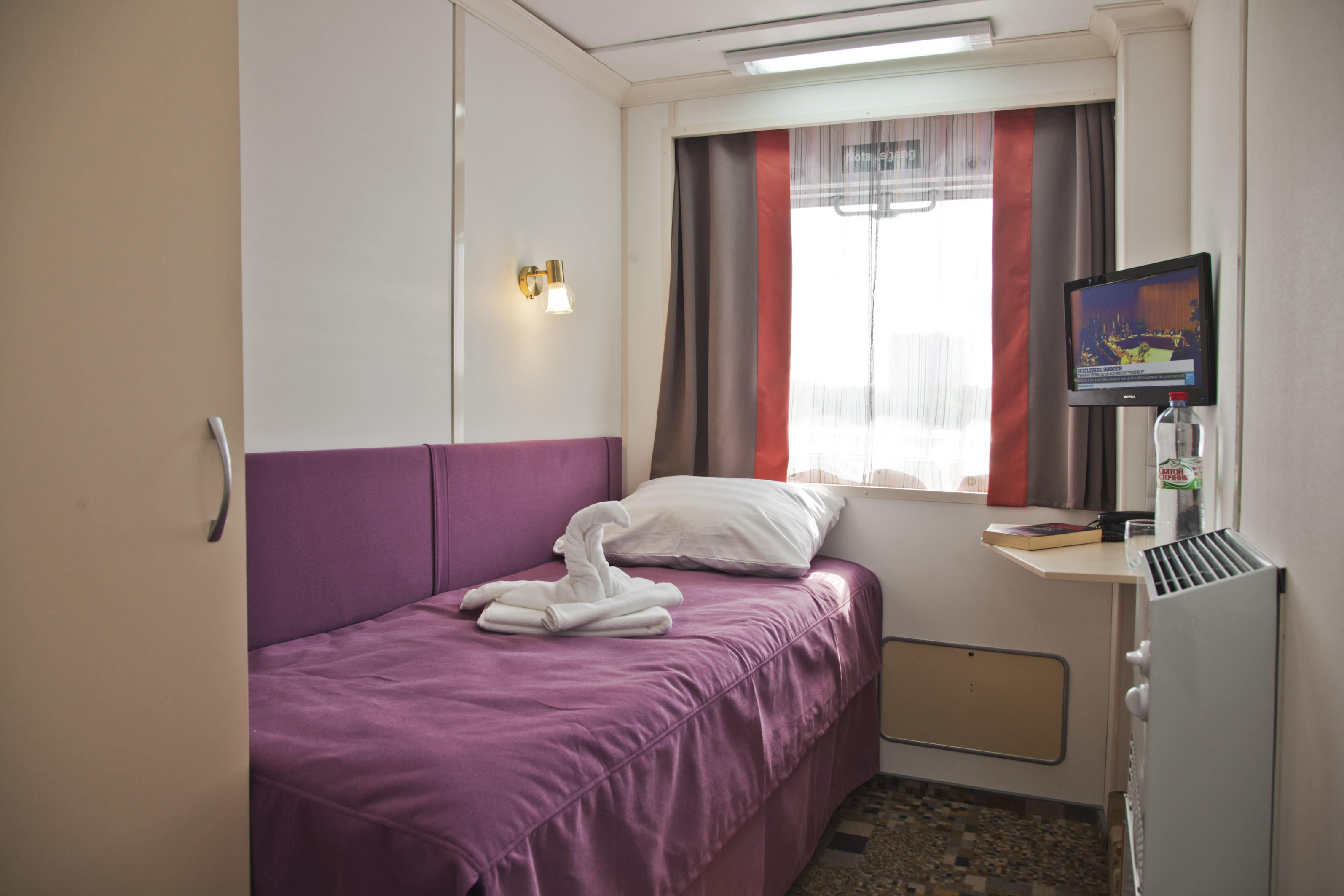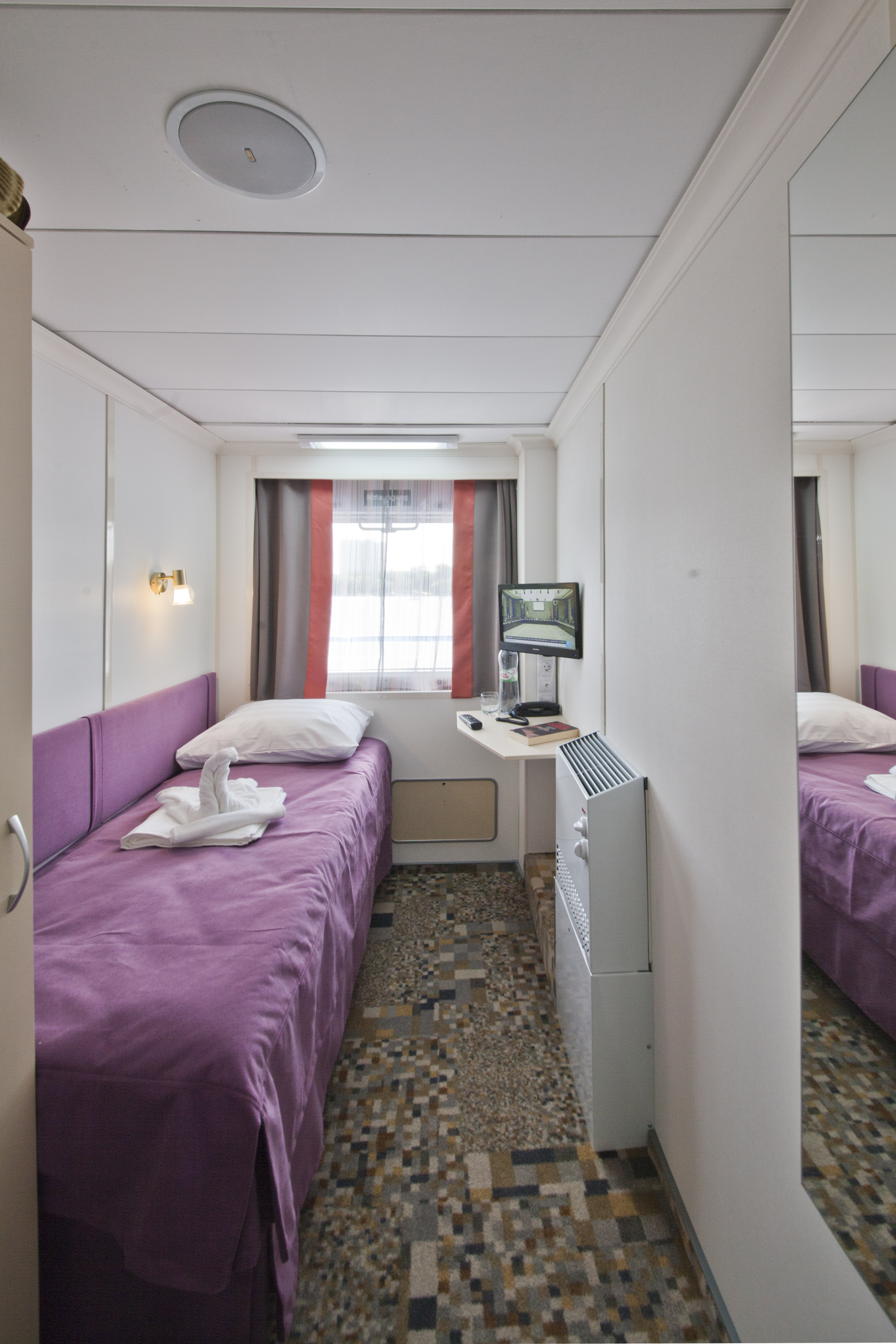 Все каюты оборудованы: кроватями, удобствами (душем, туалетом), системой индивидуального климат –контроля, мини-холодильником, радио и широкими окнами.